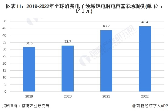 消费电子为铝电解电容器最大的应用市场,2022年全球消费电子市场较为低迷,导致消费电子领域铝电解电容器市场规模增速放缓,2022年消费电子领域铝电解电容器市场规模约46.4亿美元。