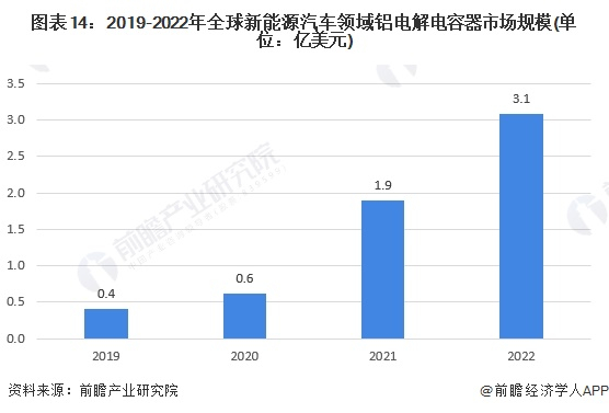 新能源汽车的启动电源、电池控制系统、充电桩等设备对铝电解电容器有着大量的需求。随着新能源汽车在汽车市场的持续渗透,带来大量的新能源汽车领域铝电解电容器市场需求,2022年新能源汽车领域铝电解电容器市场规模约3.1亿美元。
