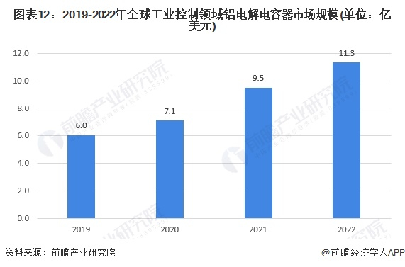 铝电解电容器在工控机主板被大量使用,受全球工业控制及自动化市场规模持续增长带动,全球工业控制领域铝电解电容器市场规模快速增长,2022年达到11.3亿美元。