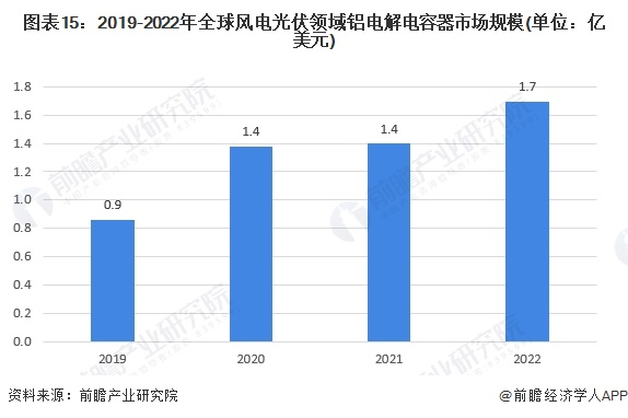 铝电解电容器因其高电压等级、高耐纹波能力和长寿命等优点广泛应用于光伏逆变器中,此外,铝电解电容器作为风力发电机组核心部件变流器的关键元件,对风力发电机组的稳定性和使用寿命具有重要影响。为实现全球各国的碳中和目标,各国均加速新能源对传统化石能源的替代,风电光伏累计装机容量不断提升,带动了风电光伏领域铝电解电容器市场规模的增长,2022年全球风电光伏领域铝电解电容器市场规模约1.7亿美元。
