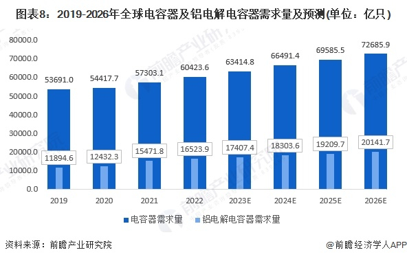 铝电解电容器作为最基本的电子元件之一,被广泛用于电子信息行业以及家电等各类电子产品之中,具有体积小、电容量大及成本低的特性,尤其是单位电容量价格在所有电容器中最为便宜,符合信息产品低价化发展趋势,广泛应用于通讯、家电、汽车、电子、航空、新材料等行业,市场需求量极大。从需求量来看,2022年全球铝电解电容器及整体电容器需求量分别达到16523.9亿只和60423.6亿只,预计到2026年全球铝电解电容器及整体电容器需求量将达到20141.7亿只和72685.9亿只。
