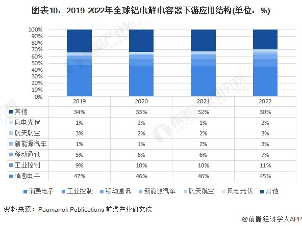 从全球铝电解电容器下游应用结构来看,消费电子是铝电解电容器最主要的下游引用领域,2022年占比约45%;其次为工业控制领域,占比约11%。此外,移动通讯和新能源汽车等领域快速发展,下游占比持续提升,2022年分别达到7%和3%。