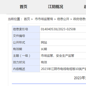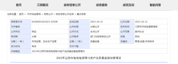 中国质量新闻网讯 据江苏省江阴市人民政府网站10月31日消息,2023年第三季度,江阴市市场监管局对电线电缆等10类产品开展了市级质量监督抽查,共抽查电线电缆、危化品包装物、危险化学品、燃气泄漏报警器、灭火器、学生公寓用品及校服、塑料管材管件、印刷品商品条码、卫生洁具和非医用口罩、熔喷布等10类产品。