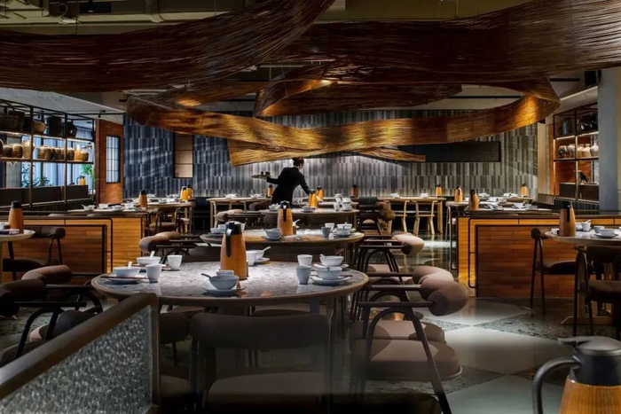 在此次改造中,餐吧在空间内打造出热带雨林花园场景。大厅采用全循环水系恒温、恒湿养殖的珍稀热带蕨类植物,将城市中喧闹的餐厅装饰成质朴的热带园林。各种鲜活的热带植物中藏着餐桌与座椅,既增加了私密感,又为食客带来别致的就餐体验。每当夜幕降临后,这里还将为食客打造科技现代的视听盛宴。