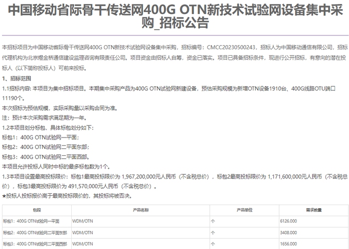 日前,中国移动发布《中国移动省际骨干传送网400G OTN新技术试验网设备集中采购_招标公告》,总价约36.3亿元。