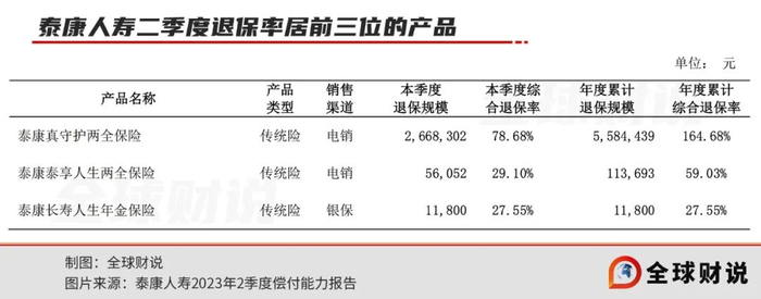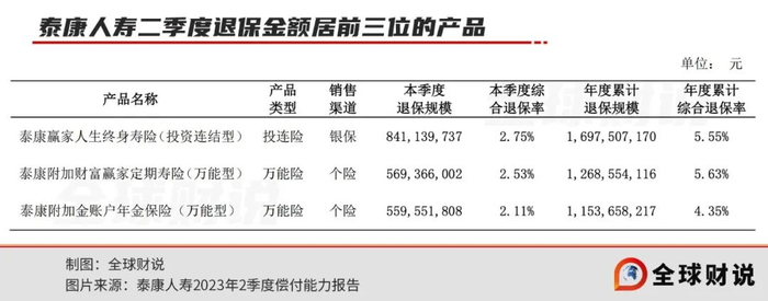 2023年第二季度,泰康人寿综合退保率居前三位的产品,年度累计综合退保率分别高达164.68%、59.03%、27.55%,但已低于去年同期的274.35%、332.87%、61.48%。