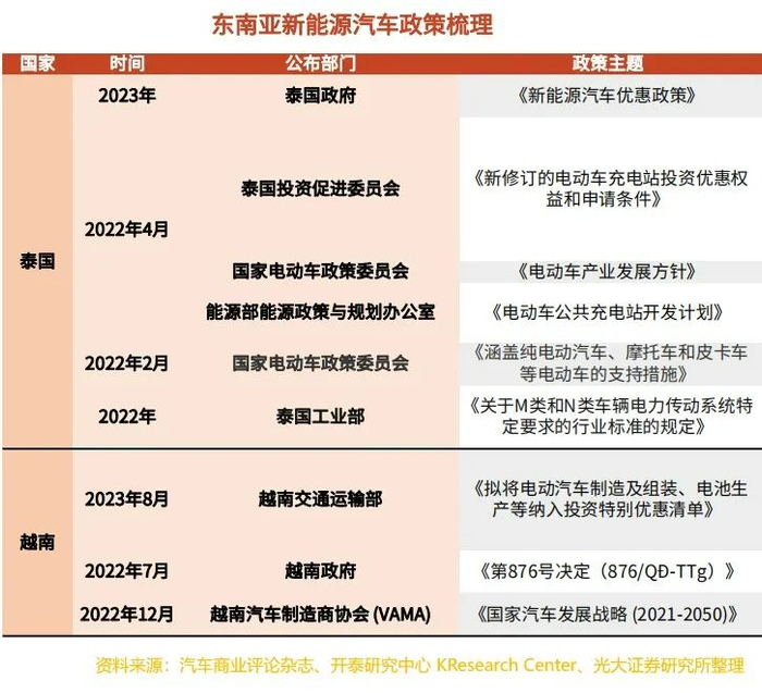 光大汽车研究团队认为,基于东南亚相对开放的新能源政策背景,中国自主车企或将短期以东南亚作为新能源车出口以及生产布局重点区域。结合车型投入与产能布局,预计泰国将成为比亚迪等车企辐射东南亚市场的关键。