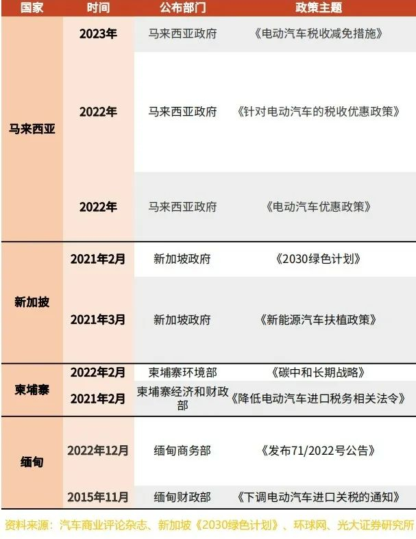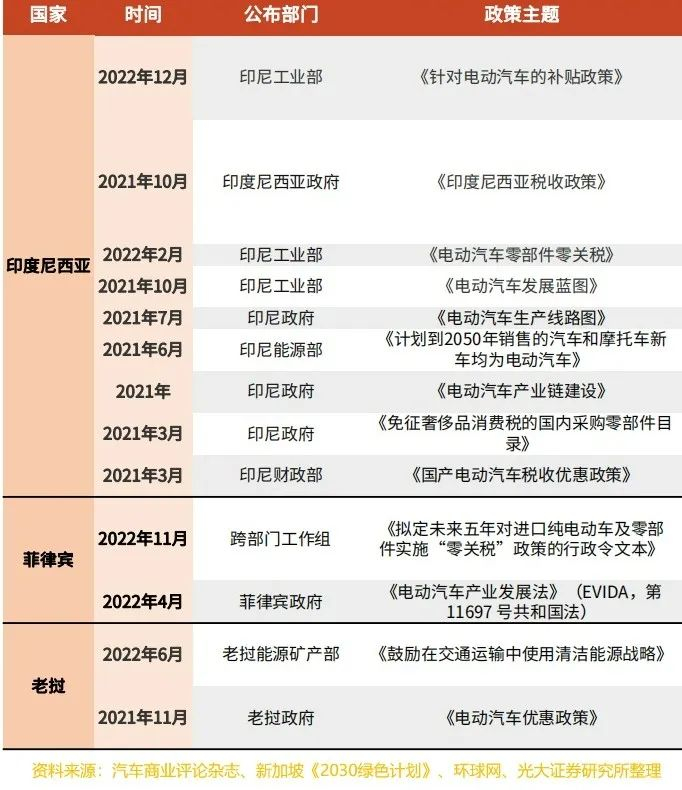 此外,据记者不完全统计,越南、印尼、老挝、菲律宾、新加坡、柬埔寨等也均有针对新能源汽车的利好政策。