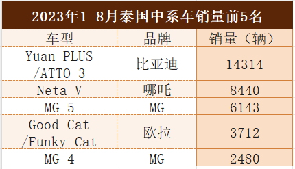 来看一组数据。以泰国汽车市场为例,泰国AutoLife网站公布的数据显示,今年前8个月,中国品牌纯电动汽车在泰国市场的市占率高达80%。其中,比亚迪ATTO 3是销量最高的车型,上牌量为1.4万辆,市占率达32.93%;哪吒V的上牌量位列第二,达到8440辆,市占率为19.41%。紧随其后的分别为MG 5、欧拉好猫/闪电猫以及MG 4,销量分别为6143辆、3712辆和2480辆。而在今年8月,泰国上牌量排名前十的纯电车型中,中国品牌车型包揽了8款之多。