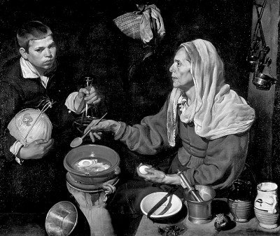 1599年,委拉斯凯兹出生于西班牙的塞维利亚,他也是在那里开始了绘画的启蒙。他在弗朗西斯科·巴切柯(1564—1644)的画室学习了六年,创作了一些静物和人像主题作品。彼时,塞维利亚等城市时常为鼠疫所扰,人满为患,民不聊生,年轻的委拉斯凯兹从人民的生活惨状中获取创作灵感,并关注西班牙平民中的普通人,把他们列入创作素材之内,例如《煎鸡蛋的老妇人》和《三个音乐家》。他的老师巴切柯虽然热衷美学与神学,认为历史画的题材高于其他类别,却也不乏对这位天赋出众的学生的夸赞,他承认委拉斯凯兹在静物画创作领域的出类拔萃。1617年3月,18岁的委拉斯凯兹加入画家公会,并开始运用弗兰德斯技法进行创作,兼容了宗教画和风俗画的特征。1623年之后,他定居马德里,并逐渐放弃了早期的绘画主题与风格手法。