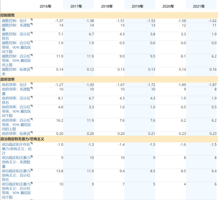 该指数由六项综合指标构成,涵盖自1996年以来200多个国家的广泛治理层面,六个测量维度如下表所示: