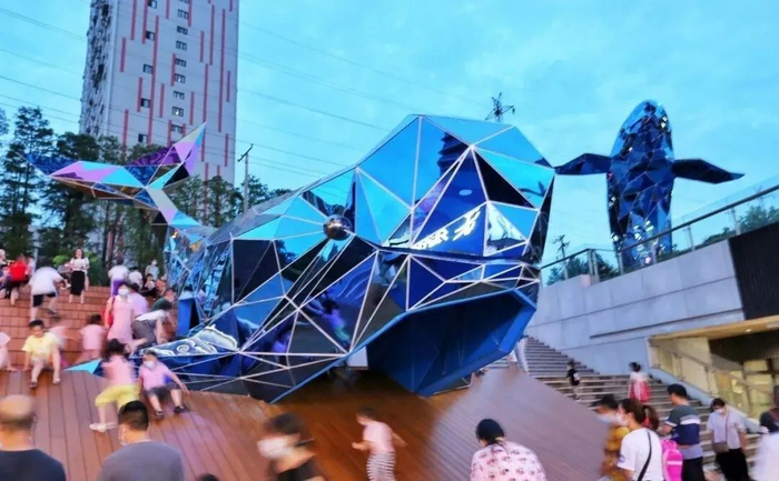 另一方面,用城市发展需求打造社会公益服务点。武汉青山印象城的入口处有一幢超大型双子江豚雕塑,这里常态化开展诸多江豚保护的公益活动,让更多市民参与到保护江豚的公益行动中。依托青年之家的公益烘焙喜鹊是一家“无声”面包店,为听障人士提供就业机会,以公益力量打造有温度的商业空间。