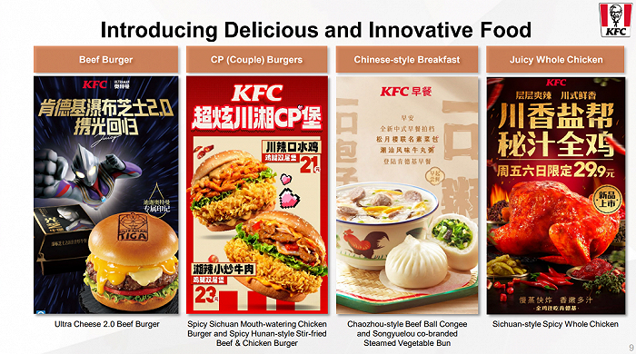 她又表示,肯德基还在持续通过引入更多新口味来扩大这些品类,如推出川香盐帮秘汁整鸡,以及与咸蛋超人合作,推广瀑布芝士2.0汁汁厚牛堡。