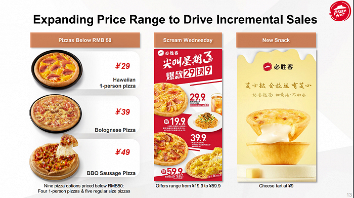 “这(指50元以下披萨)在整个披萨市场中占据了非常重要的份额。我们现在提供的披萨中,大约20%的价格是低于50元的。但这还不够,我们还可以做得更多。目前,必胜客未能充分满足这一市场,而通过丰富我们的低价披萨产品,我们可以抓住这一巨大机会。”屈翠容说。