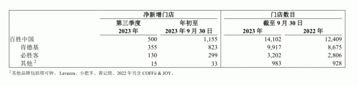 今年前九个月,百胜中国净新增门店数创纪录,达1155家,其中三季度共净新增500家门店。截至2023年9月30日,门店总数达14102家,其中肯德基达9917家,必胜客为3202家,其他品牌(包括塔可钟、 Lavazza、小肥羊、黄记煌)共983家。