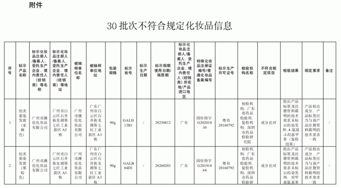 截自国药监局除此之外,还有染发膏检测出未标示成分。怡美姿染发膏(亚麻色)、传颜染发膏(自然黑色)以及Brimles泡泡染发剂(棕黑色)等产品被点名。上述产品不符合规定的项目均为成分比对,如怡美姿染发膏(亚麻色)就检出了产品标签及注册资料载明的技术要求未标示的染发剂:4-氨基-2-羟基甲苯。