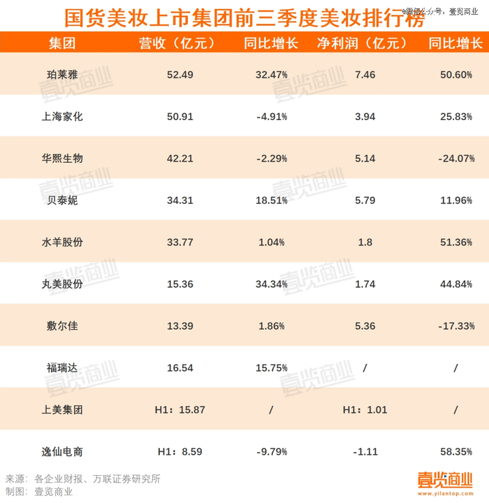 壹览商业统计10家国货美妆上市企业的最新数据发现,前三季度,包括未披露三季度季报的上美集团及逸仙电商在内,依然有5家企业完成了营收及净利润双增长。