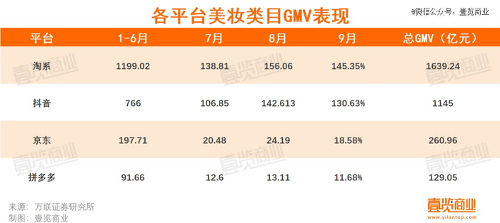 据品观统计,今年前三季度,抖音美妆GMV整体超1130亿元。万联证券研究所数据显示,前三季度淘系、京东、拼多多三大渠道美妆类目GMV分别为1639.24亿元、260.96亿元、129.05亿元。