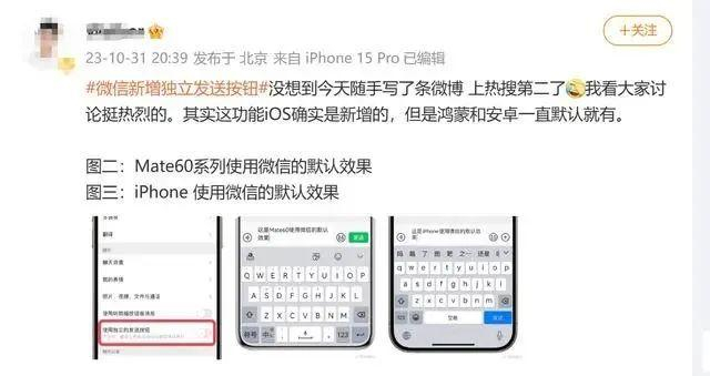 更新后在【微信】-【我】-【设置】-【通用】-(新增)【使用独立的发送按钮】,默认关闭,手动开启后,键盘上的发送按钮就会替换成换行。