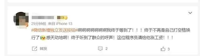 不少网友为该功能点赞:“终于不再是自己打空格换行了”“苹果终于可以支持换行了”“终于出这个功能 ”“试了试,感觉不错”......