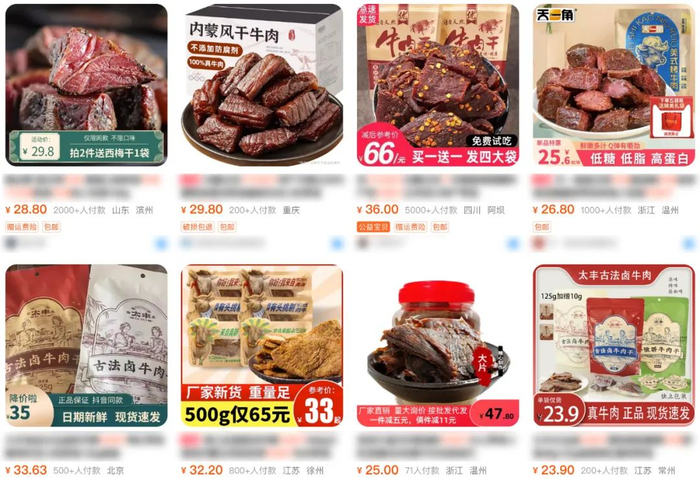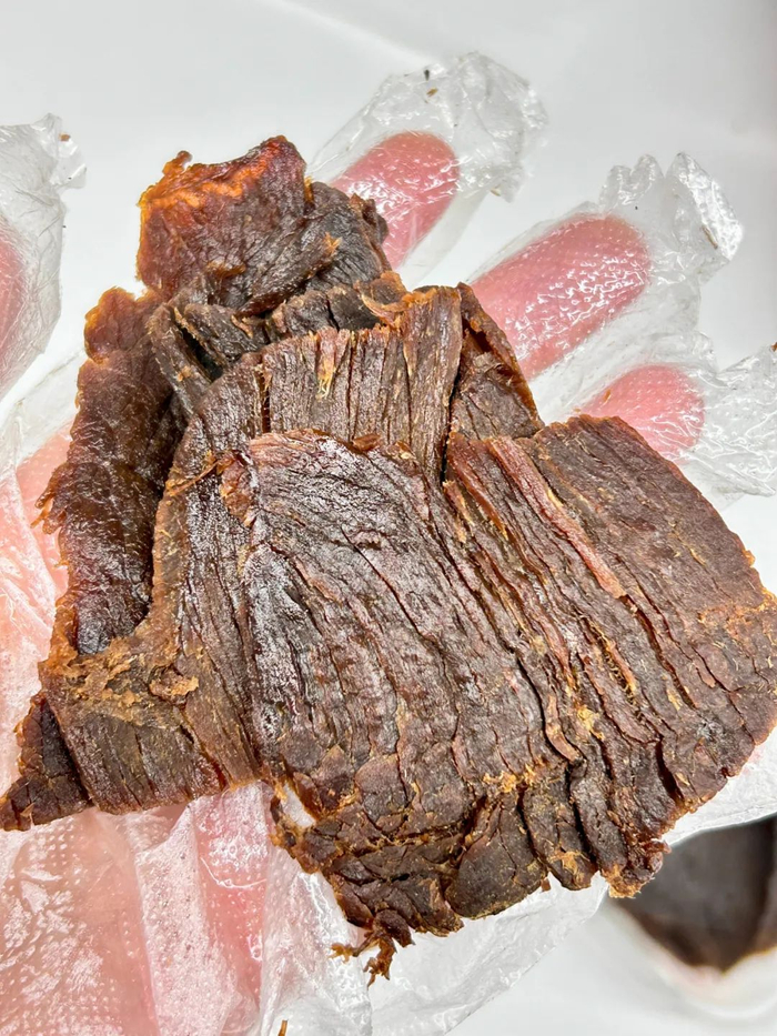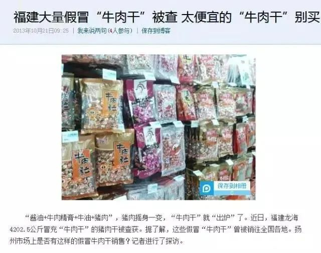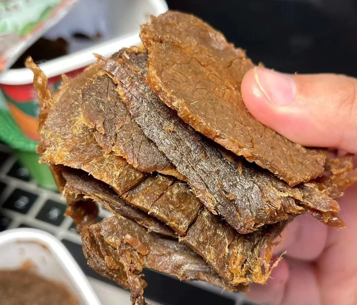 光牛肉成本价都¥100+了,那些三四十块一斤的“牛肉干”,很可能是碎肉拼接、走私冷冻肉,甚至用牛肉膏腌制后的猪肉、鸭肉冒充。