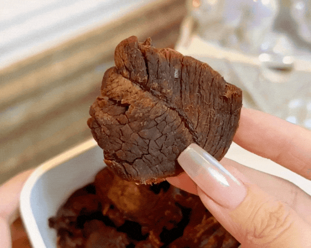 所以这款牛肉干干湿适中,比例刚刚好,不像某些地方的牛肉干,邦邦硬,吃了都牙疼,太适合小编这种牙不太好的人啦!