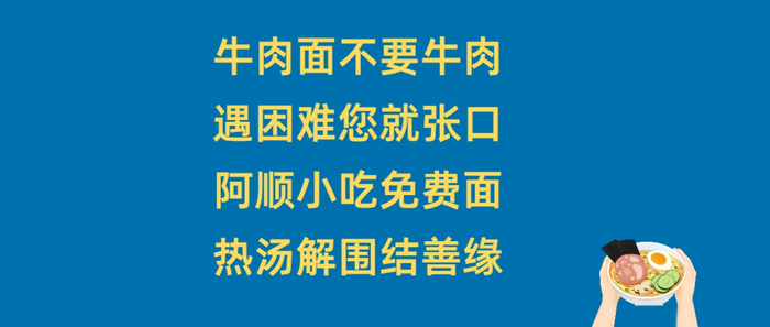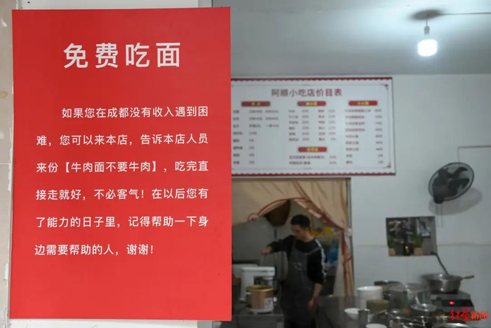 “如果您在成都没有收入遇到困难,您可以来本店,告诉本店人员来份‘牛肉面不要牛肉’,吃完直接走就好,不必客气!”