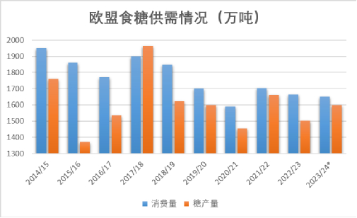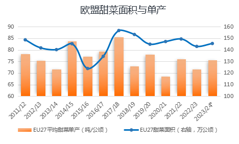 23/24榨季欧盟甜菜没有遭受类似前两个榨季的高温、干旱天气影响,加上甜菜价格上涨,预计面积扩大至145.5万公顷,同比小幅增加1.7%,预计欧盟27国糖产量将较上一年增长逾6%,至1550万吨。