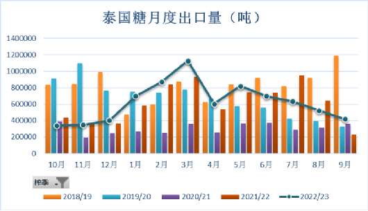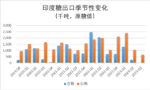 自2020年中旬以来至今,巴西雷亚尔兑美元汇率开启断崖式贬值,持续刺激巴西糖出口积极性,加上今年国际糖价大幅上涨刺激糖厂套保进度提前,预计巴西2023/24榨季可供出口糖在3100-3300万吨。今年4-9月巴西累计出口糖1653万吨,同比增加15.89%,考虑到同期接近24%的产糖量增幅以及创新高的糖库存,截至9月底的出口节奏偏慢,主要受到与创纪录的谷物出口竞争的影响,月度糖出口量受限,意味着本榨季巴西糖出口的高峰期或将延至今年底,由于巴西出口大部分以原糖为主,预计将使得4季度的原糖贸易流供应接近平衡状态。