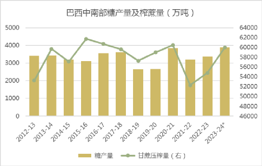 巴西中南部23/24榨季甘蔗面积预计同比增加0.4%,至734.37万公顷;甘蔗单产同比增加7.7%,至80.391吨/公顷;甘蔗产量同比增加7.3%,至5.9亿吨;糖产量预计同比增加11%,至3722.33万吨;乙醇产量预计同比增加4.9%,至253.69亿公升。不过,目前市场对于中南部甘蔗及糖产量的预估普遍高于CONAB,对于甘蔗产量预估区间达到了6.15-6.25亿吨,糖产量预估达到了3900-4100万吨,同比增加500-700万吨左右,若预估兑现,本榨季将创下该国有史以来最高糖产量记录。