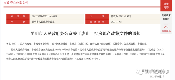 11月2日,昆明市政府官网发布《昆明市人民政府办公室关于废止一批房地产政策文件的通知》,决定废止2017年、2018年出台的相关房地产政策,意味着昔日发布的商品房限售限购政策全部取消。