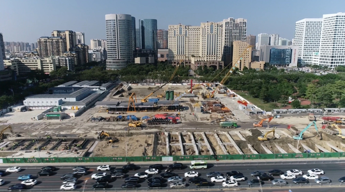 时代广场站是粤东城际铁路汕头至潮汕机场段第二座地下车站,位于中山东路与金环南路路口东侧,沿中山东路东西向布置,为地下三层侧式站台车站,总面积1.9万多平方米,正在进行基坑土方开挖和混凝土支撑施工。