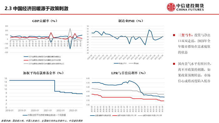 再看国内方面,最近国内经济数据有了一定的修复,这种修复我们认为更多的是政策刺激的结果。展望后市,国内经济表现如何可能更多地还是要关注政策上的发力。其中地产在中国经济中占比较高,如果地产表现依旧疲软的话,那么国内需求可能很难出现明显的增长。