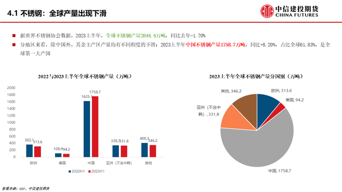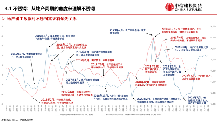 首先看不锈钢,今年上半年全球不锈钢产量出现了下滑,而中国还是增长态势。我们也关注到,年内不锈钢厂还是出现了一定的亏损,而产量仍旧维持增长是因为国内市场较为“内卷”,钢厂并不愿意轻易率先减产。需求角度看,不锈钢是地产后周期产品,地产竣工数据对于不锈钢价格存在领先关系。在今年保交楼政策驱动下,钢价存在一定支撑,但是待保交楼政策退出后,如果住房市场需求侧仍未好转,那么不锈钢的价格很难乐观。