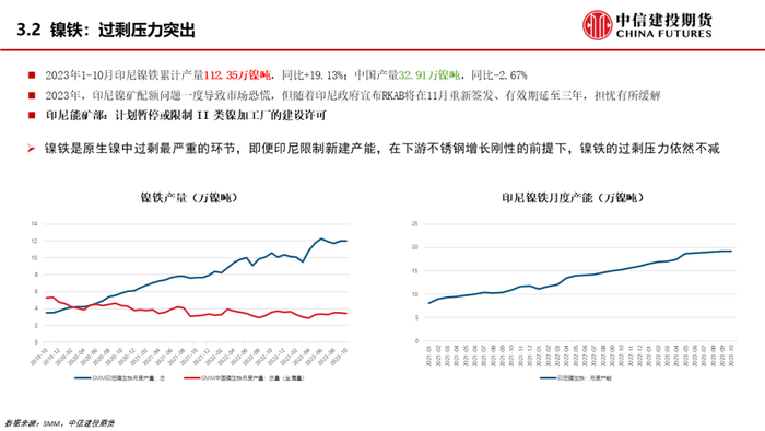 镍铁方面是过剩最为严重的环节,主要是因为印尼产能的不断扩张。虽然印尼想要限制新的火法冶炼厂进一步扩张,并且也出现过镍矿配额这样的扰动,但是仍然不改镍铁扩张的趋势。比如印尼限制火法冶炼的问题上,虽然新投产的工厂会受到限制,但是有一些已申报、待投产的产能依然在等待释放。