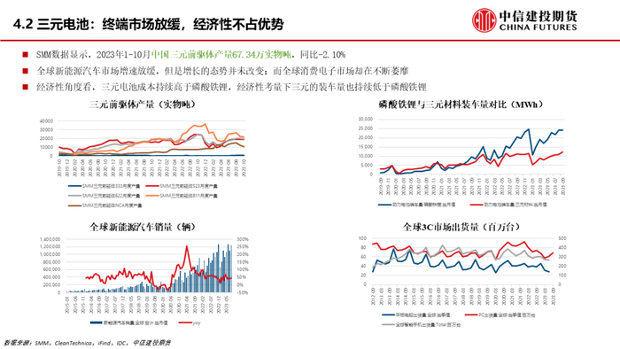 再看三元电池。受车企降本驱动,市场更偏好经济性占优的磷酸铁锂,三元的市场份额不断走弱,但是一些高端车型还在装配三元电池,整体来说在维持缓慢增长的态势。而3C等其他需求也在不断走弱,导致三元电池整体增速不及预期。
