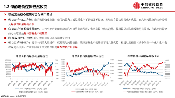 从研究的角度看,镍的研究框架明显不同于其他品种,镍的研究逻辑一直在改变。起初随着镍铁供应的不断增加,低价的镍铁开始逐步取代纯镍成为不锈钢的主要原料,这段时间内镍的定价逻辑是镍铁对纯镍的替代。时间来到2020年-2021年左右,新能源产业快速增长,前驱体等下游对镍的拉动效应较为明显,通过镍豆溶解来制备硫酸镍的技术被大量应用,在此期间镍的定价逻辑是镍豆溶解制备硫酸镍。再看2023年,由于纯镍与硫酸镍价格出现倒挂,产业链成本出现反转,产业开始用硫酸镍为原料反过来去生产电积镍,这也是目前镍价分析中的重要一环。总的来说,目前镍产业链整体较为复杂,因为中间产品的相互转化在不断发生。展望未来,如果镍价持续下跌,那么产业会不会重新回归用镍豆溶解制备硫酸镍呢?我们认为这种可能性是存在的,不过也要指出,随着中间品的供应不断增加,中间品也有可能会持续挤压纯镍在新能源产业中的应用。