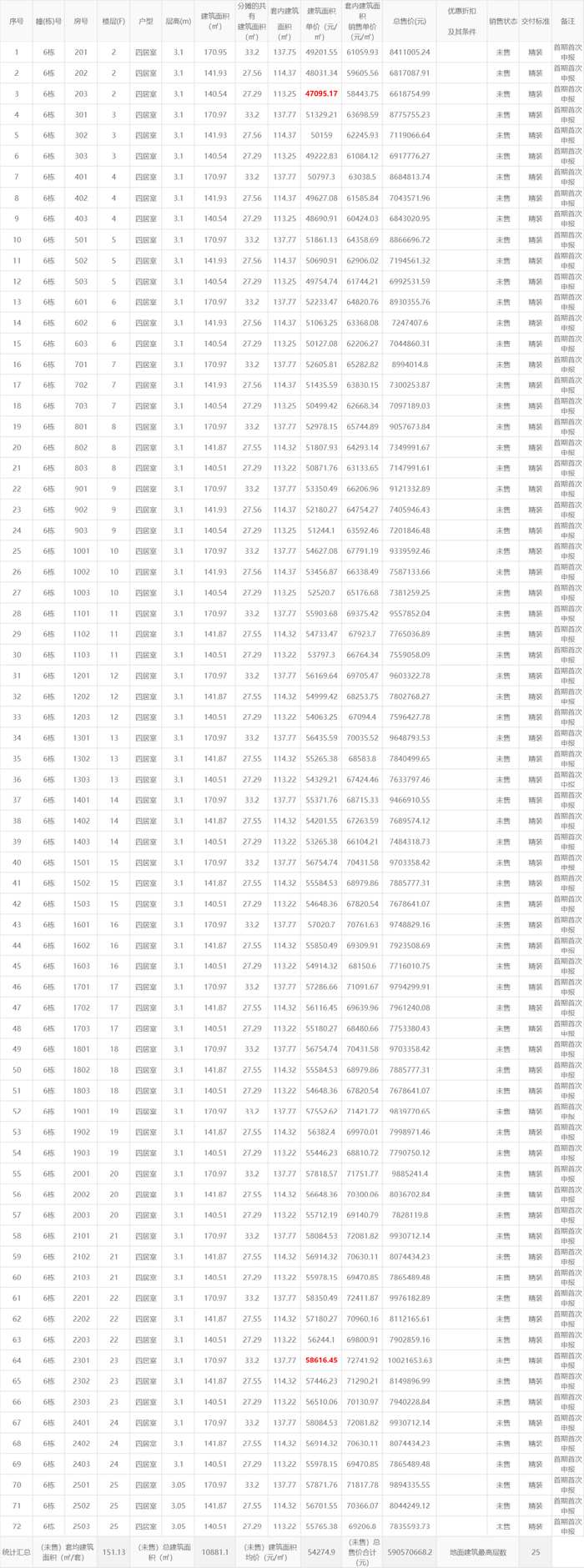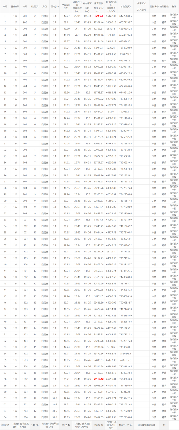 其中,1号楼高17层,推出64套房源,整体备案均价为51087.12元/㎡。6号楼高25层,推出72套房源,整体备案均价为54274.9元/㎡,均为精装备案。最低一套备案价为45495.1元/㎡,最高一套备案价为58616.45元/㎡,总价在约647-1002万元之间。(文末附备案价详情)