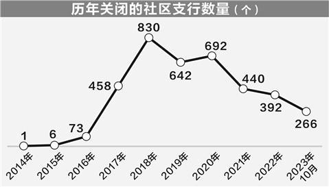 国家金融监督管理总局数据显示,截至2023年10月30日,我国共有4349个社区支行。而自2014年8月以来,社区支行退出数已达3800个,与现存数量比达0.8:1。这意味着,我国社区支行数已减少近一半。