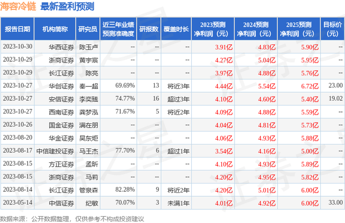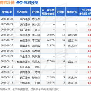 海容冷链2023年三季报显示,公司主营收入24.98亿元,同比上升7.83%;归母净利润3.56亿元,同比上升32.58%;扣非净利润3.54亿元,同比上升36.08%;其中2023年第三季度,公司单季度主营收入4.89亿元,同比上升14.77%;单季度归母净利润8608.31万元,同比上升29.07%;单季度扣非净利润8487.69万元,同比上升33.72%;负债率27.46%,投资收益1174.32万元,财务费用-3569.89万元,毛利率29.75%。