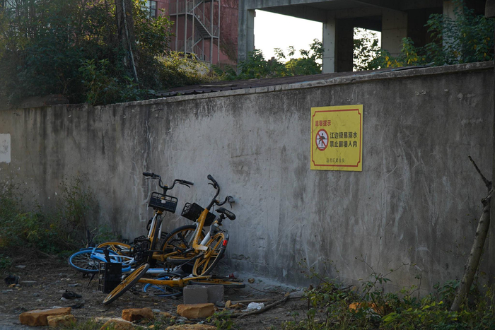根据工作人员的指示,记者走到小路尽头,看到了博主们的“翻墙点”——其中一个点位在围墙下面,特意堆放了多辆废弃的共享单车,游客需要踩着单车翻越围墙。