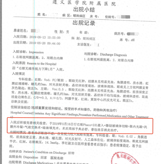 据王先生介绍,2019年5月,他的父亲因右眼视力下降前往遵义医学院附属医院眼科就诊。经检查确诊为右眼视网膜脱离和双眼白内障,于当天住院等待治疗。5月16日,医生给王先生父亲实施了“右眼白内障超声乳化白内障摘除+人工晶体植入+微创玻璃体切除+眼光内凝+巩膜外冷凝+气液交换+硅油填充手术”,患者于5月20日拿药出院。