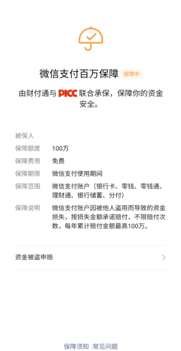 微信支付“百万保障”由财付通与中国人保财险PICC联合承保,用于保障用户的资金安全。此项保障默认开通,只要用户在使用微信支付期间,发生微信支付账户被他人盗用而导致资金损失的情况,均可申请赔付,每年申请赔付金额最高100万元。