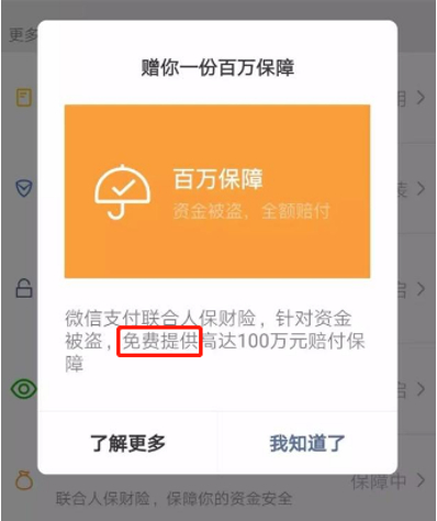 此项保障是完全免费的,用户可以在微信-我-服务-钱包-消费者保护-安全保障中,查看自己的微信支付“百万保障”。保障不会“到期”或者“过期”,不会要求“缴费续保”,更不会影响征信。