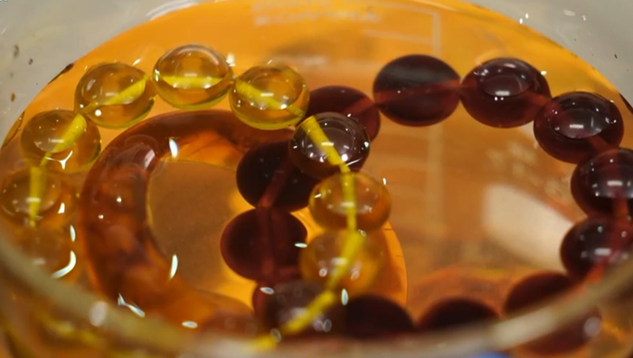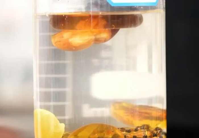 但现在很多新型的塑料经过改进后,它的密度也相应下降了,不少不法分子借此造假,所以很多新型塑料伪造的假琥珀可以躲避我们上述用的一般饱和盐水的筛选。专家打假团队经过多次实验,通过调整盐水比例,发现此时,我们用密度为1.109克/立方厘米的盐水,就能将很多由新型塑料仿制出来的假琥珀鉴别出来了。特别提醒的是:检测的时候要注意,为了确保实验的准确性,琥珀上面一定不能带有绳索或者镶嵌有其他饰物。
