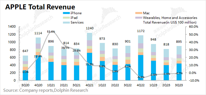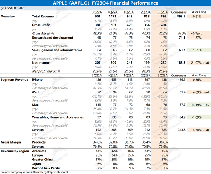 1.1 收入端:2023财年第四季度(即3Q23)苹果公司实现营收895亿美元,同比下滑0.7%,基本符合彭博一致预期(893.1亿美元)。对于本季度收入略有下滑,主要受Mac和iPad业务需求不足的拖累。