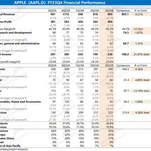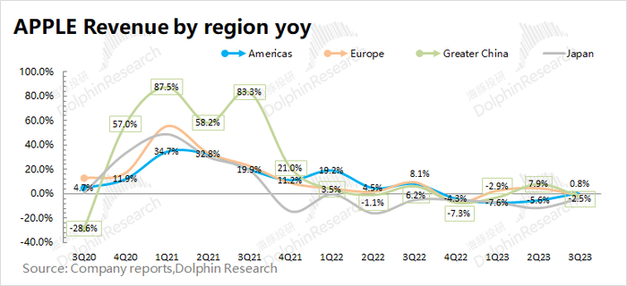 从环比来看,Mac业务环比有所回升。海豚君认为整体PC行业经历长时间的去库存后,当前已经开始逐步回暖。而苹果Mac业务本季度的表现,也是疲软阶段的相对正常表现。
