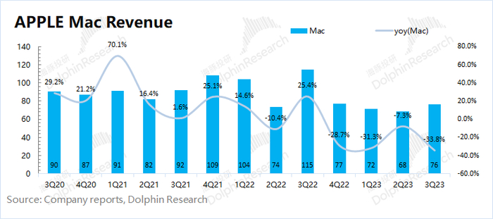 2023财年第四季度 Mac 业务收入76亿美元,同比下滑33.8%,是硬件端最低于市场预期的(87.7亿美元)。