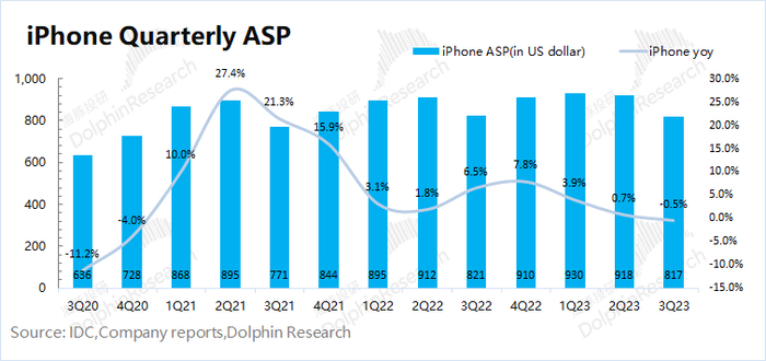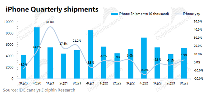 1)iPhone 出货量:根据IDC的数据,2023年第三季度全球智能手机市场同比增长0.3%。苹果本季度出货量增速为3.3%左右,公司的增长表现优于整体市场;