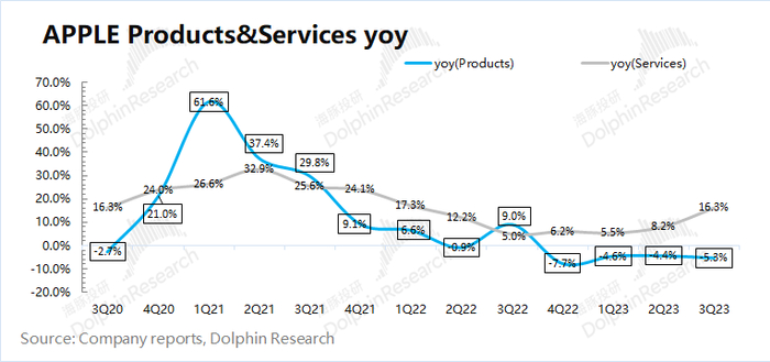 ①苹果公司本季度的硬件业务增速为-5.3%。本季度硬件端的下滑最主要是受Mac和iPad业务全面下滑的拖累。而其中Mac业务虽环比有所回升,但同比有较大的回落;